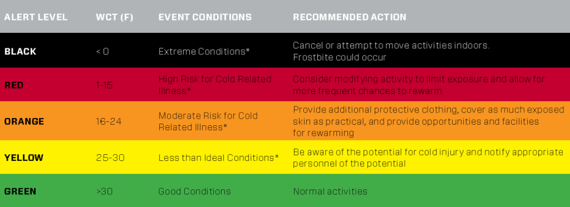 Use this chart below to determine the alert level at your location based on the wind chill temperature.
