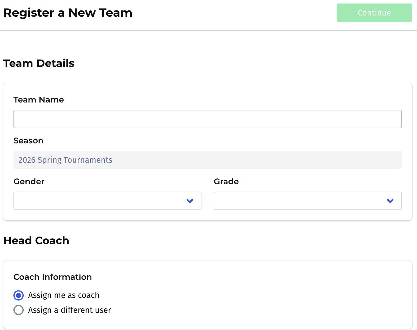 Assign me as a coach, or if you are a parent registering on behalf of the team but not the coach,