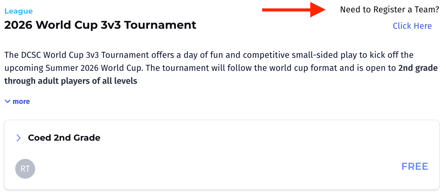 On your PlayMetrics account, navigate to Club Programs and select "2026 World Cup 3v3 Tournament" to begin the registration process. Click on "Need to Register a team? Click Here" to register the team.