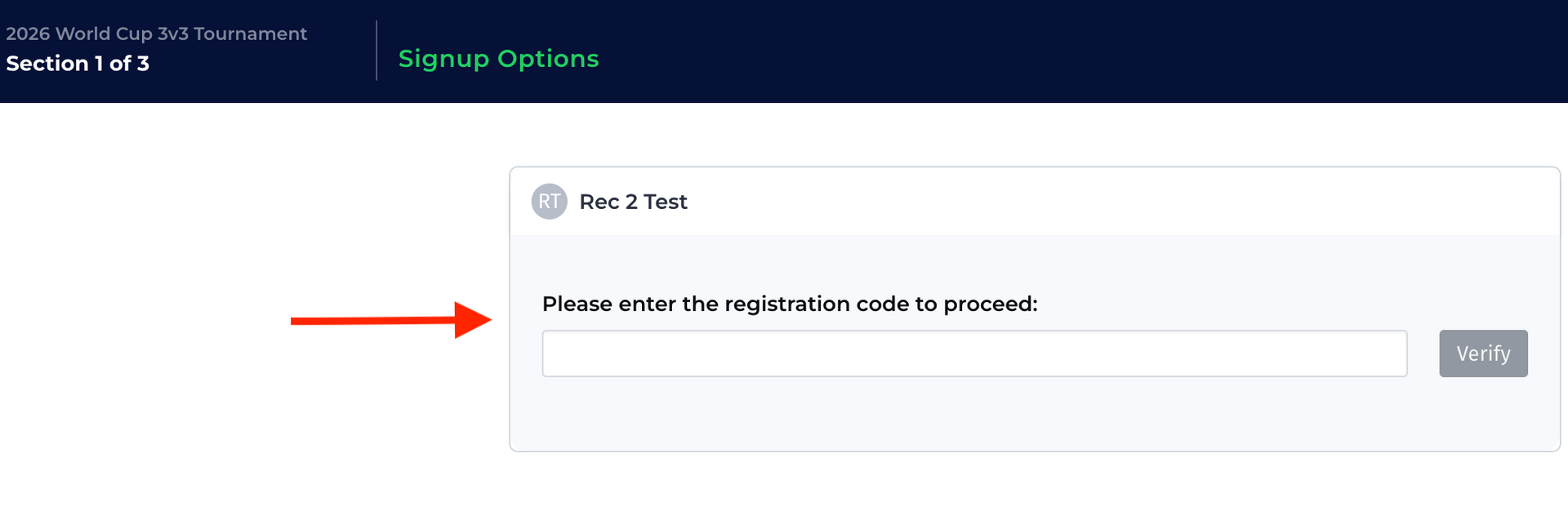 Step 1: Your player's coach will need to provide you with a team code. Enter the team code to proceed to Step 2.